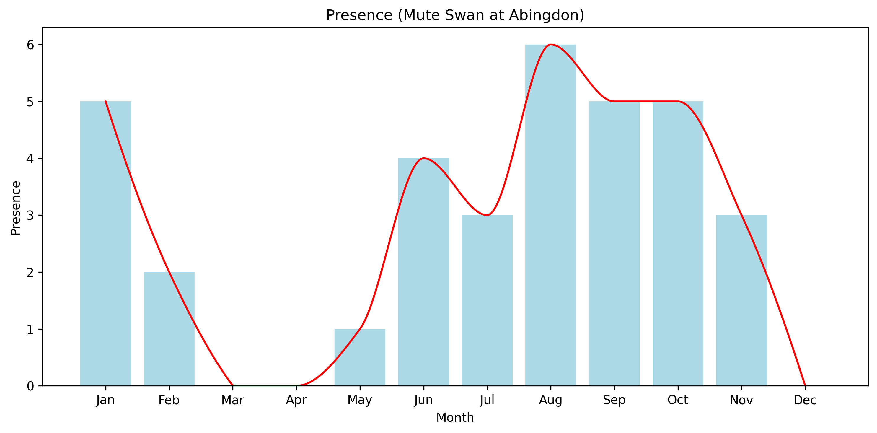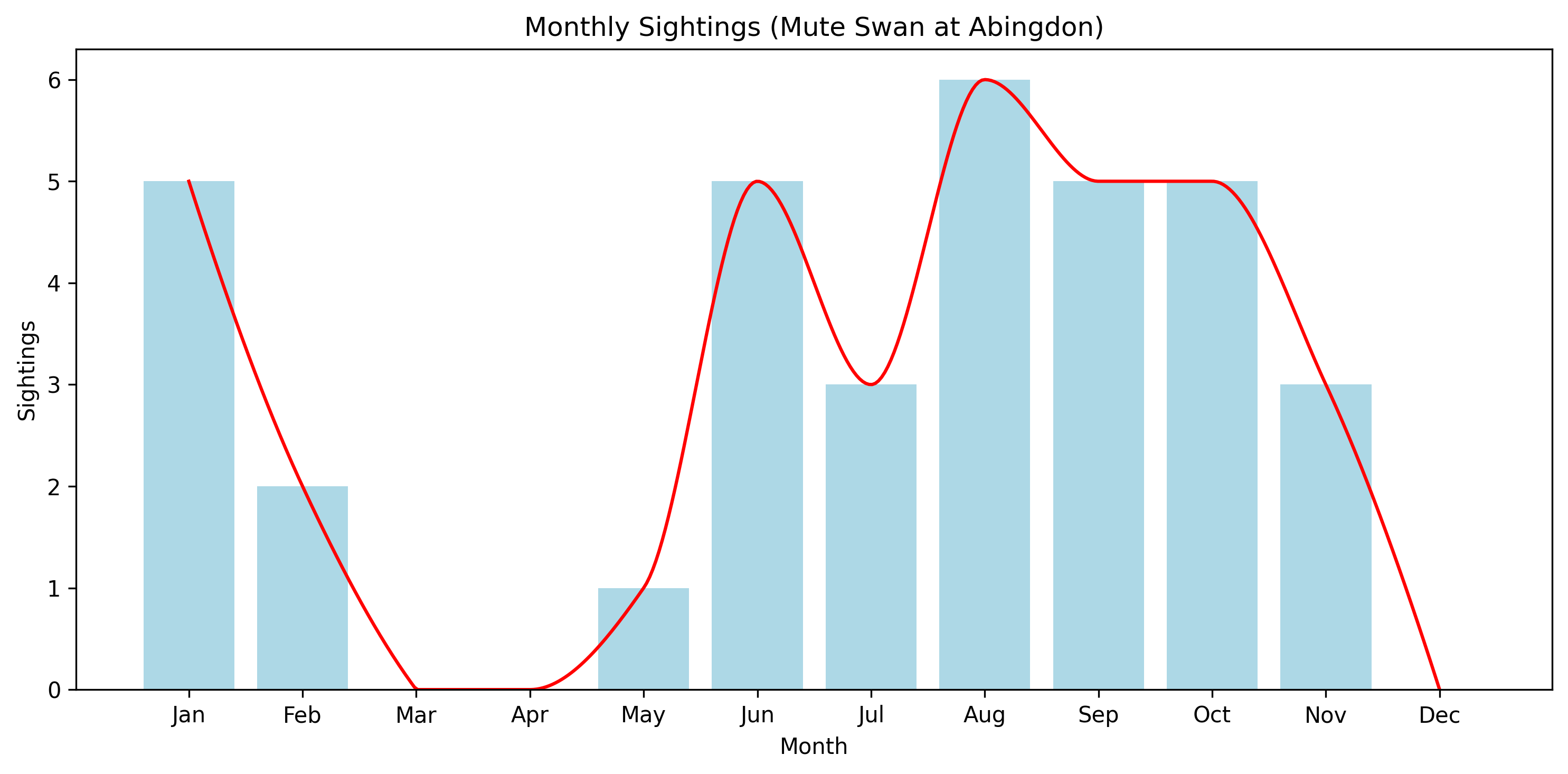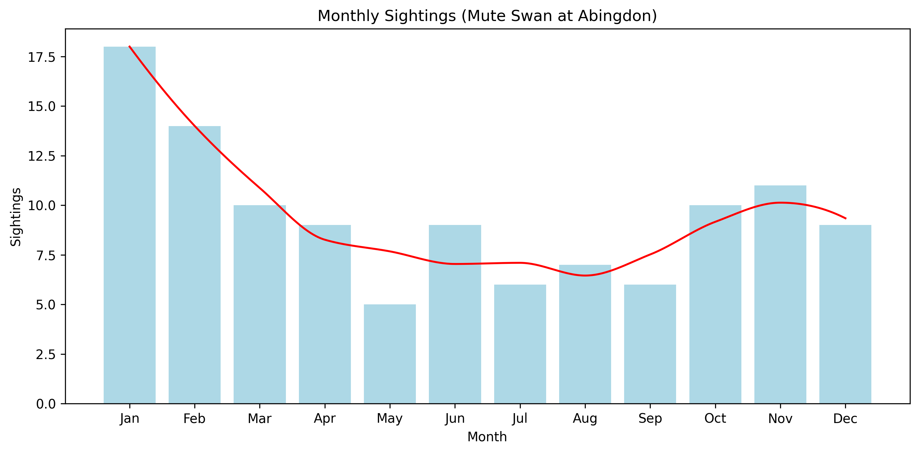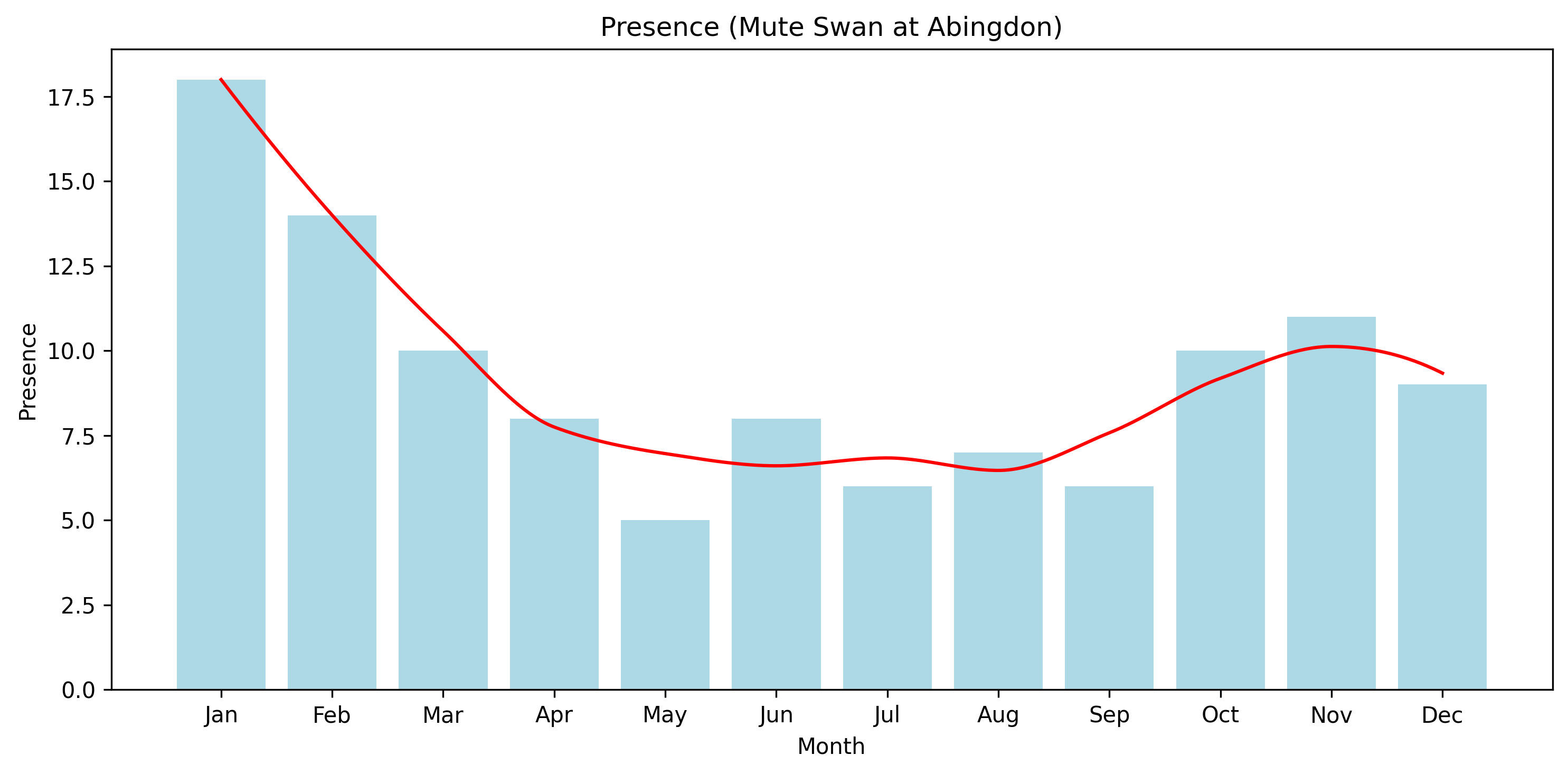The Mute Swan is recorded throughout the year, with a relatively even distribution compared to more strongly seasonal species.