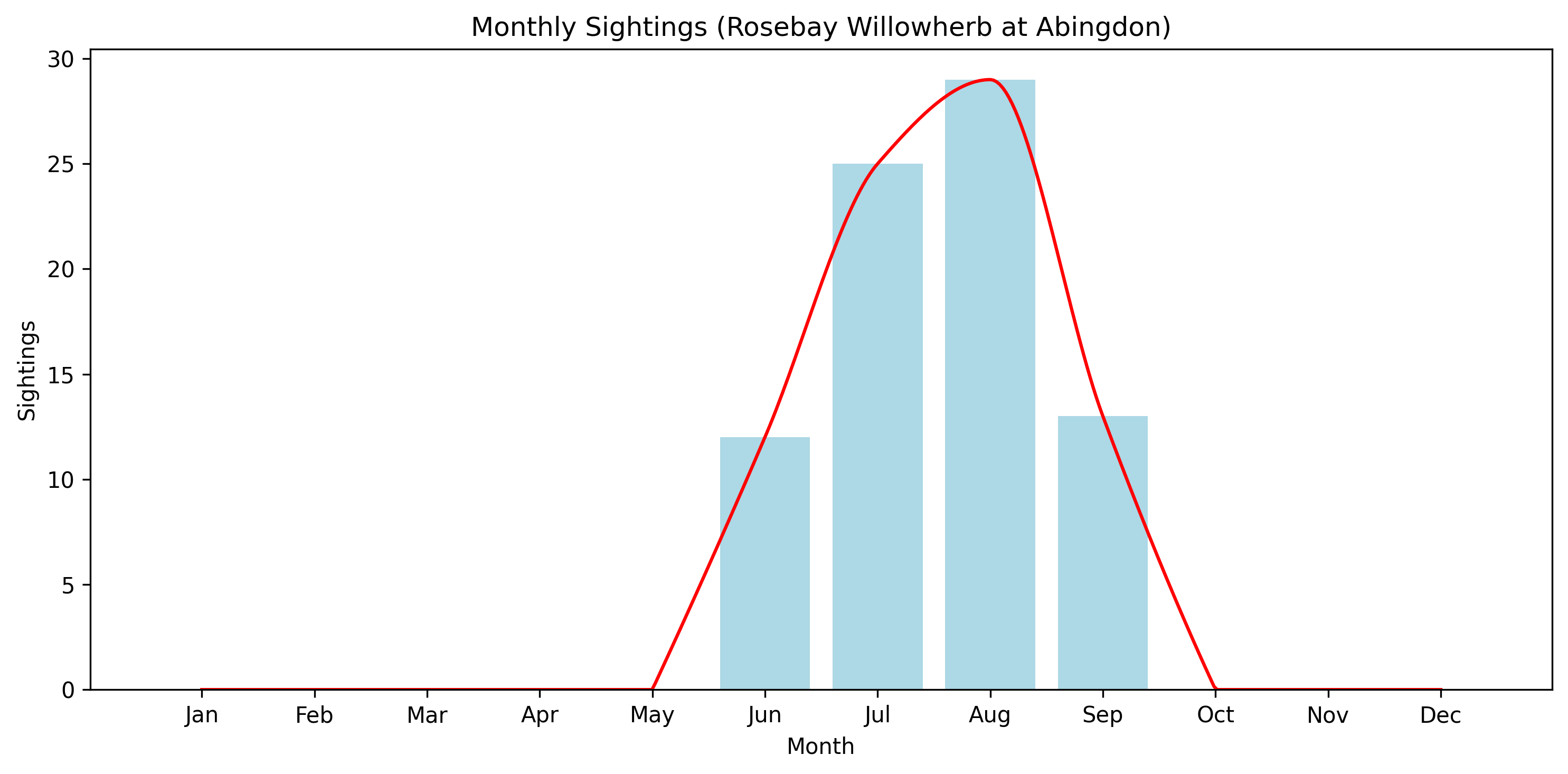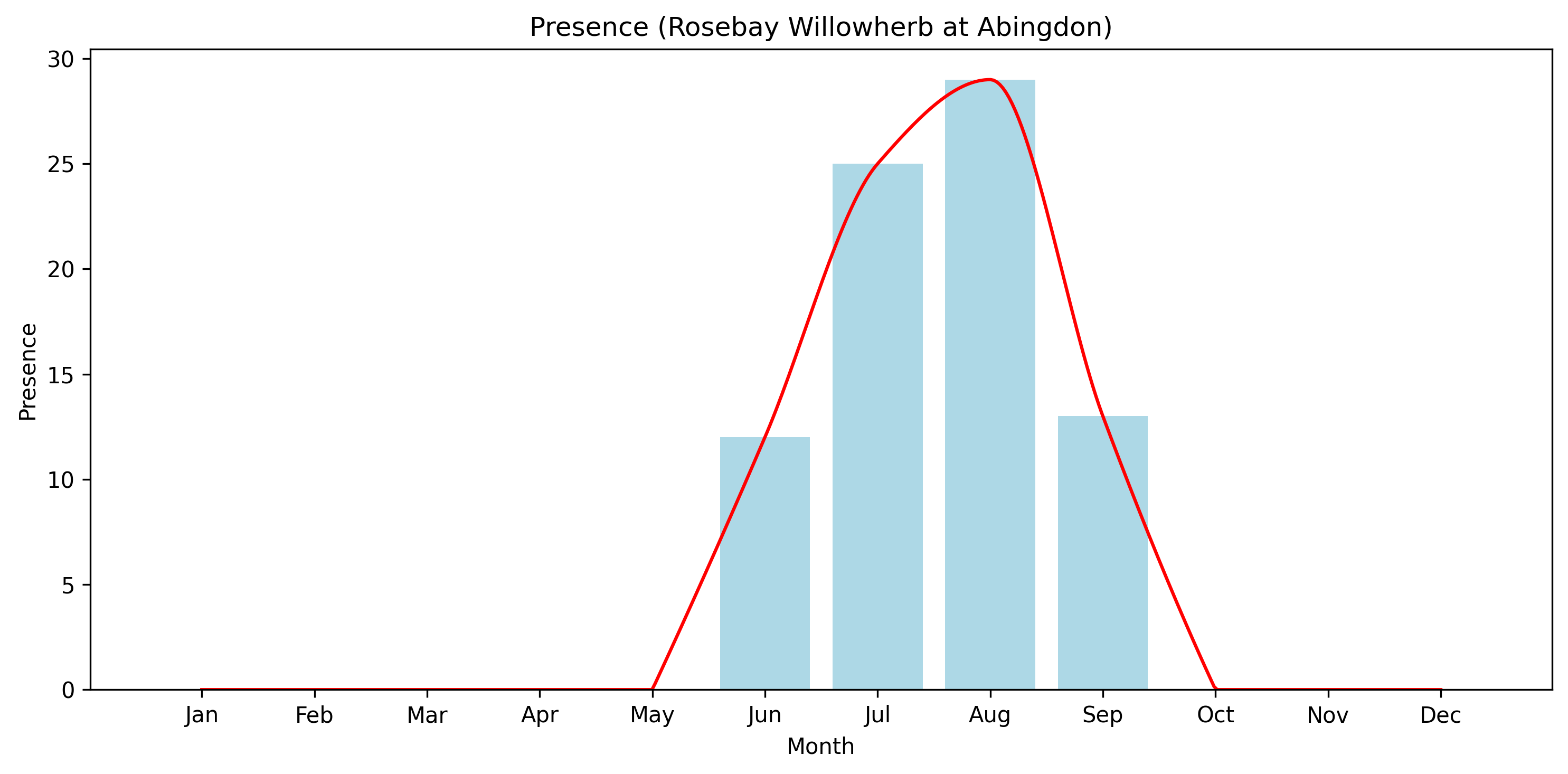 For species such as Rosebay Willowherb, flowering is concentrated into a distinct seasonal window. The absence of records outside this period reflects the absence of flowers rather than absence of the plant.